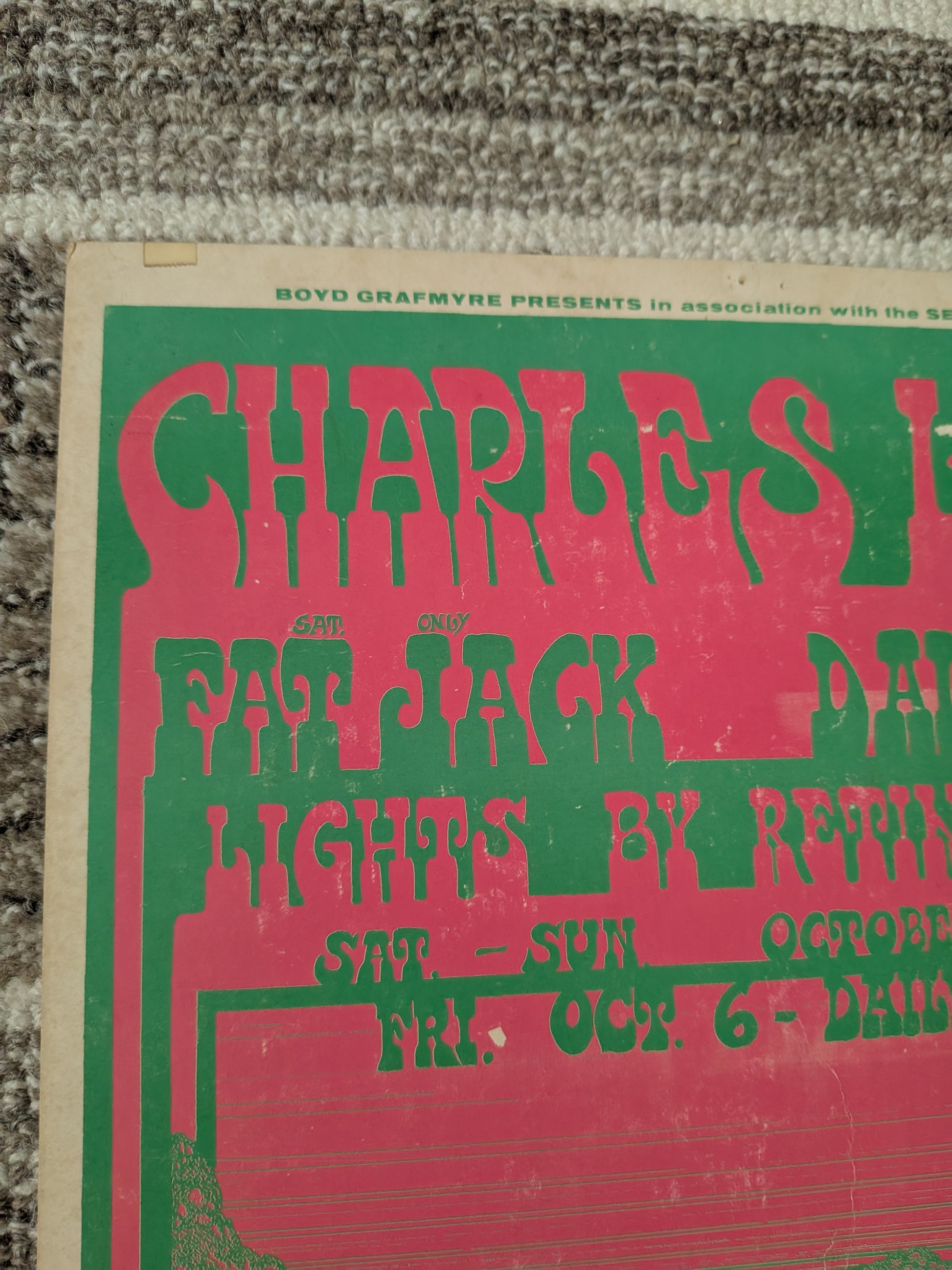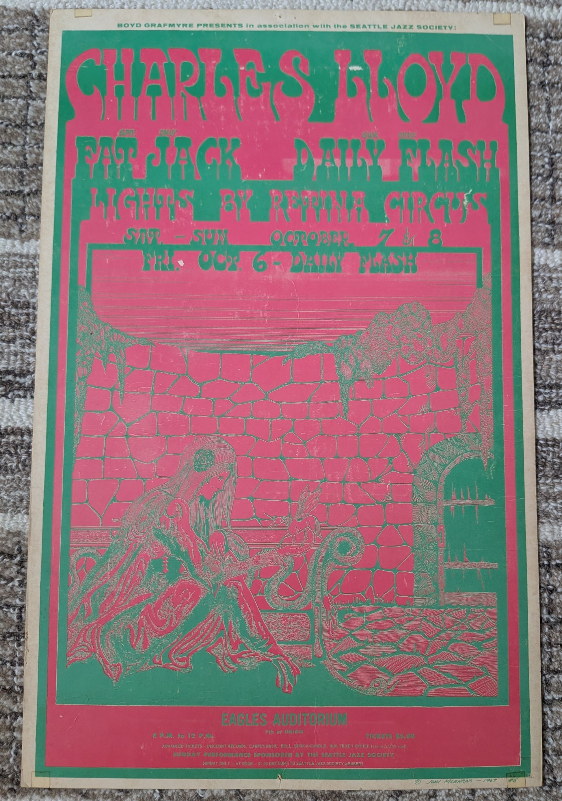 Original first-printing concert poster for Charles Lloyd at Eagles Auditorium in Seattle, October 6–8, 1967. Presented by Boyd Grafmyre in association with the Seattle Jazz Society. Support from Fat Jack and Daily Flash, with light show by Retina Circus. Artwork by noted Northwest poster artist John Moehring, printed in bold pink and green with a fantasy-style illustration and ticket info at the bottom.