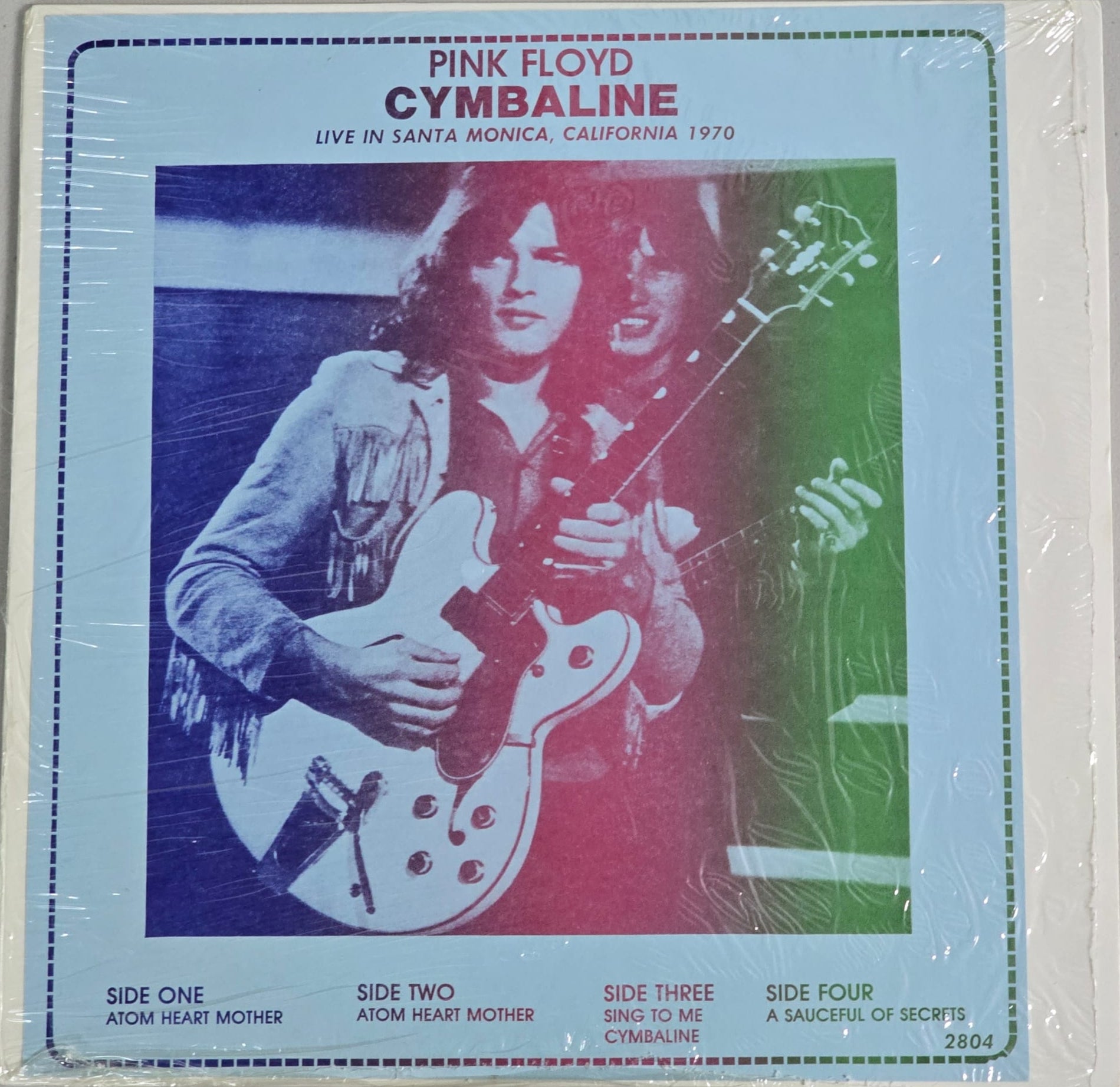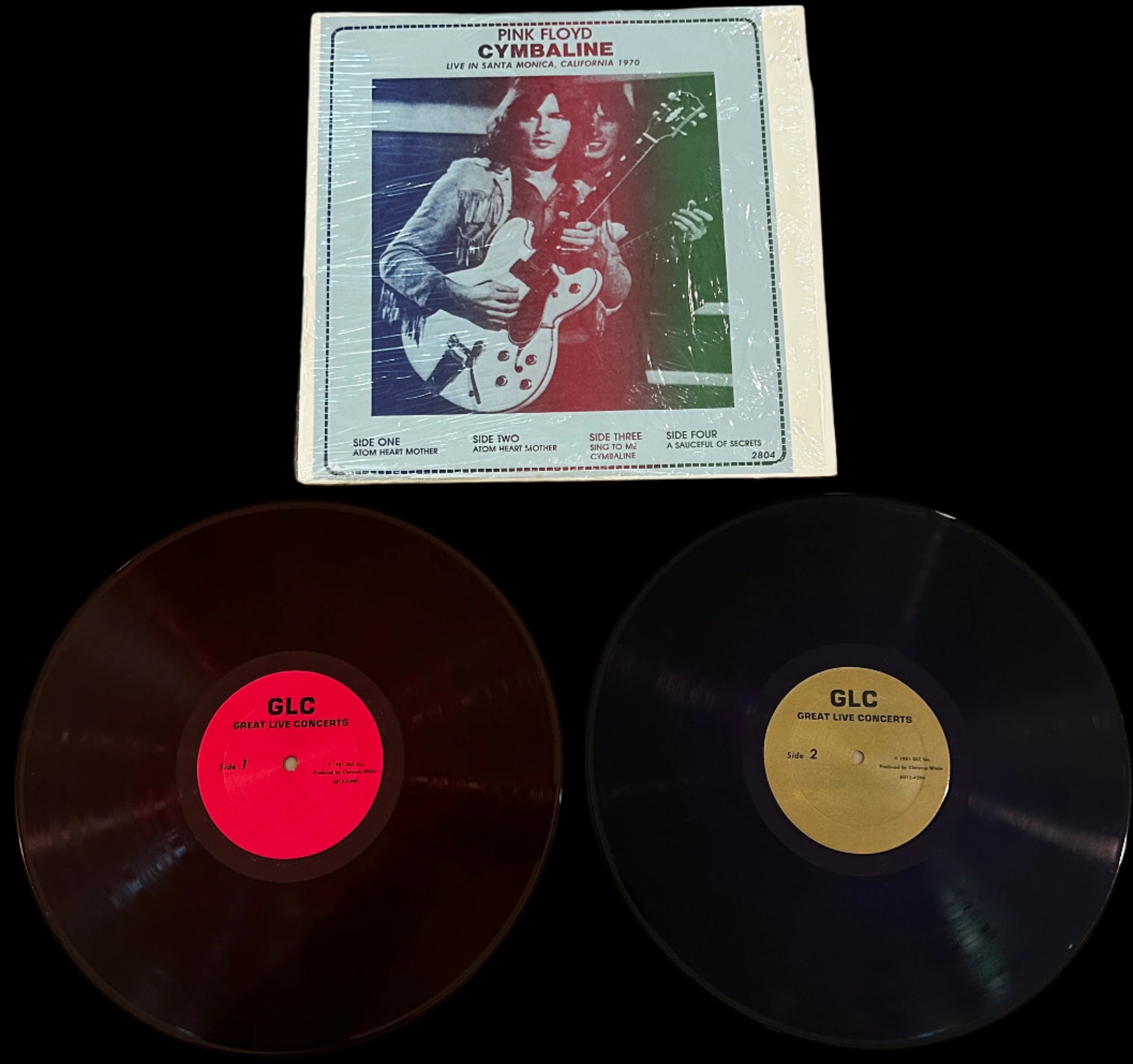 Per floydboots.com: US BOOTLEG IN PLAIN COVER WITH PAPER INSERT. RE-ISSUE OF 'CYMBALINE' (2804 A/D) ON MAGENTA AND VIOLET COLOURED DISCS. SAME PAPER INSERT WITH GLC LABELS. 100 NUMBERED COPIES WITH 'COLORED VINYL' AND COPY NUMBER RUBBER STAMPED ON THE BACK COVER. SOURCE: CIVIC AUDITORIUM SANTA MONICA LOS ANGELES 23-10-1970.