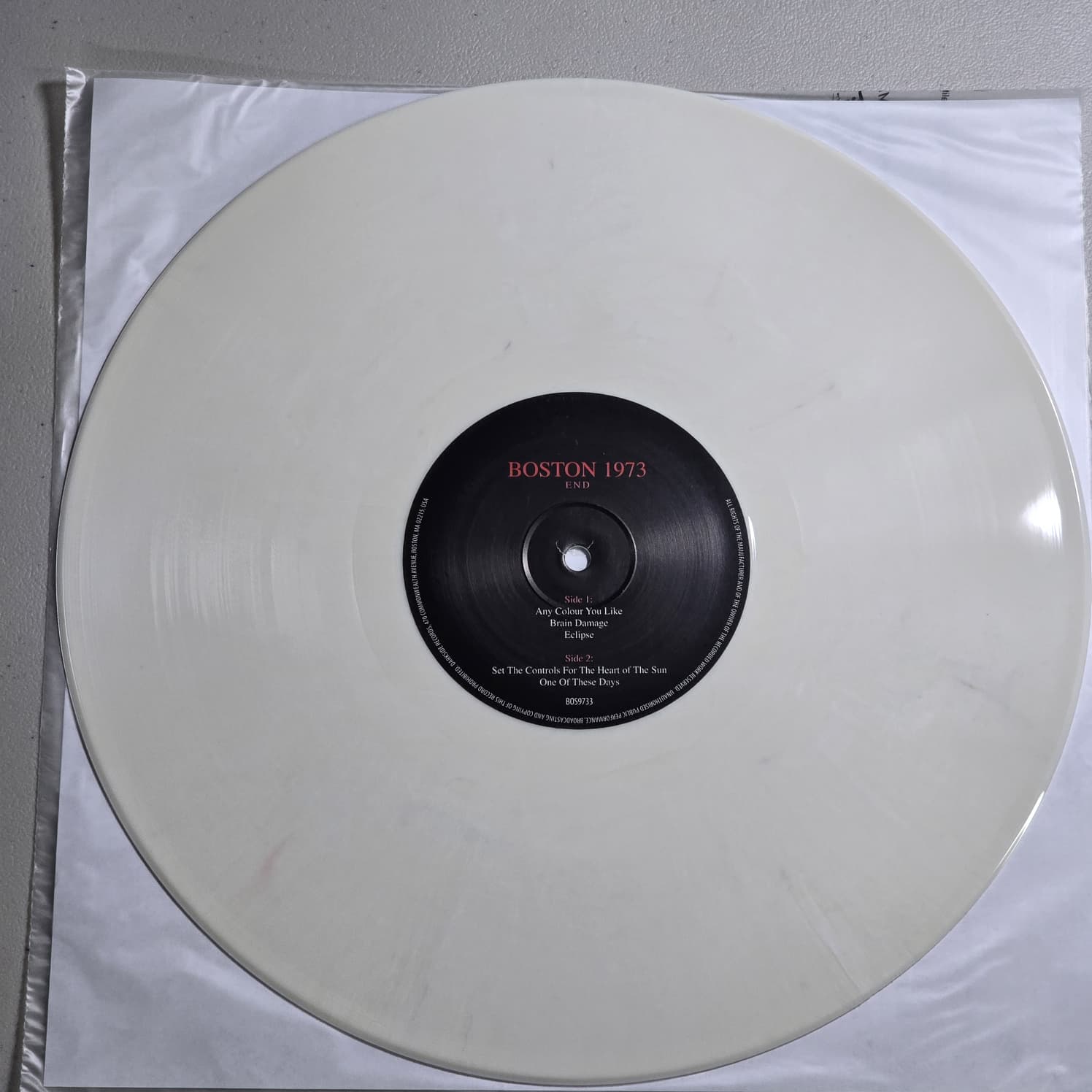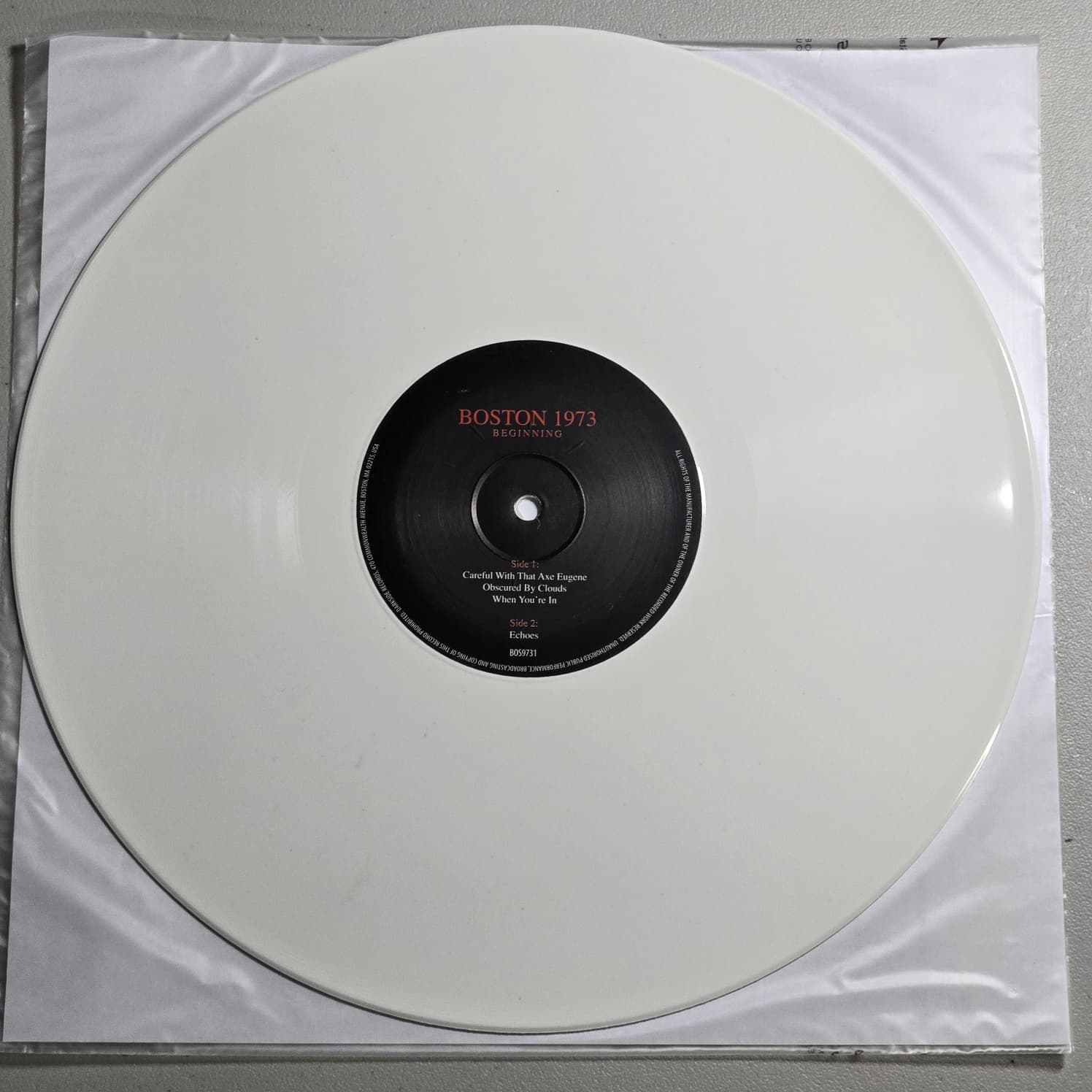Unofficial Pink Floyd release titled Boston Music Hall 14th March 1973. Issued in Bosnia in 2018 on Great Pink Wonder (BOS9734-3). Stereo recording. Three LP set on marbled white vinyl. Matrix: BOS8731-A1. Limited edition of 150 copies.