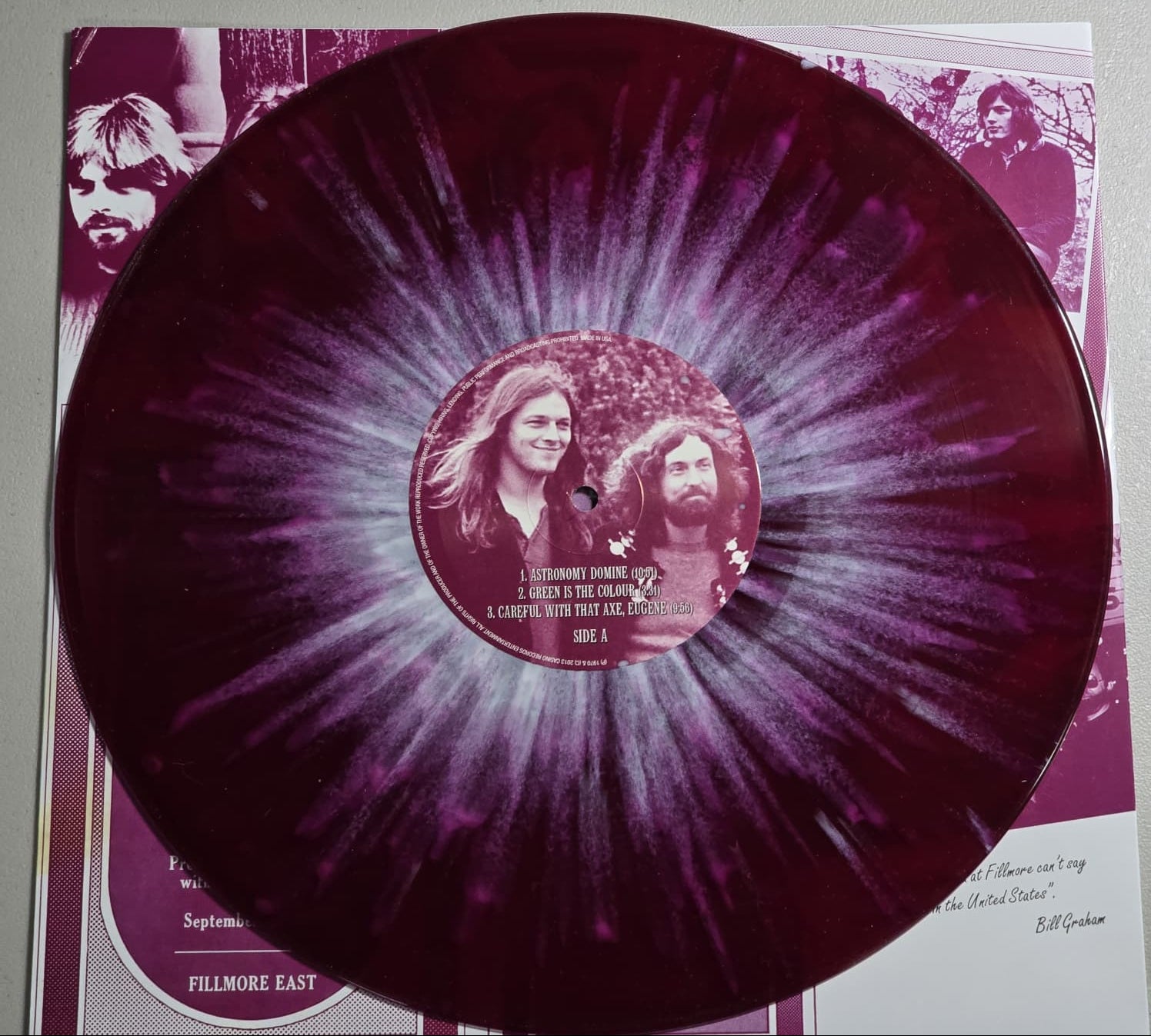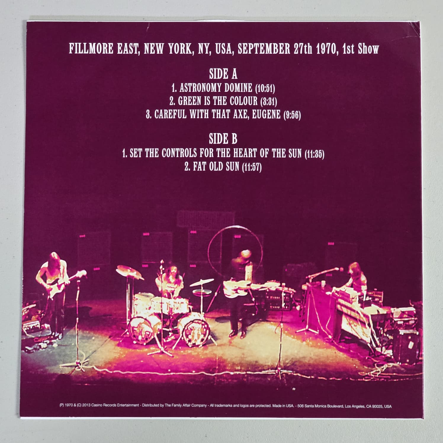 Unofficial Pink Floyd release titled Fillmore East September 27, 1970. Issued in Europe in 2015 by Casino Records Entertainment (no catalog number). Stereo recording. Edition numbered #61 of 400 on purple splatter vinyl.