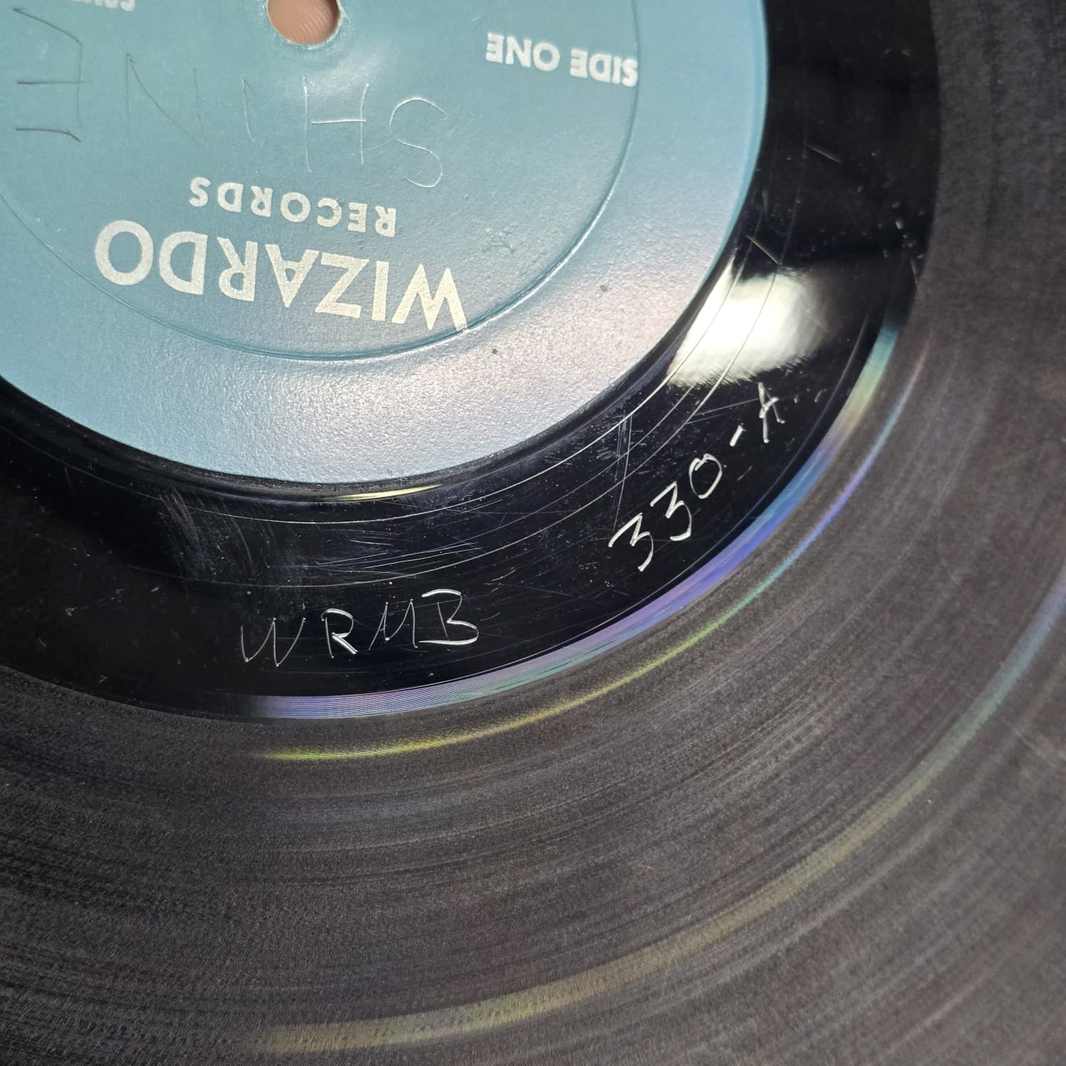 Black vinyl with light surface scuffs. Side A label has pen writing that reads “SHINE.” Overall clean copy.
